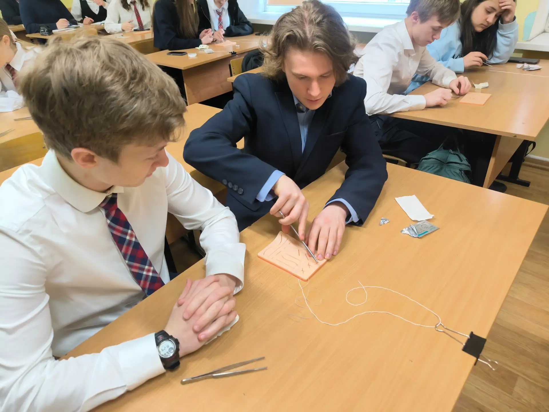 23 марта у медицинского 9В класса прошло продолжение удивительного профориентационного практического занятия «Хирургические узлы» с сердечно-сосудистым хирургом Федерального центра высоких медицинских технологий Шиленко П. А.. Учащиеся активно практиковались в наложении швов с помощью иглы и зажима. Было очень познавательно и полезно.